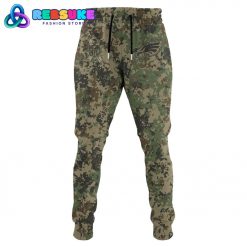 The design of the Philadelphia Eagles x U.S. Veteran Day Night Game 2025 Hoodie Set is a masterful blend of military-inspired elements and iconic team branding. The set features a classic military camouflage pattern that is prominently displayed on the hoodie’s sleeves and throughout the entire pair of pants. This camo print serves as a respectful nod to the U.S. armed forces and their dedication. The main body of the hoodie is a solid, olive green, providing a perfect and rugged canvas for the featured graphics. On the left chest, a dedicated space is available for a custom name, allowing for a personal touch, while the bold “PHILADELPHIA” text on the right side proudly represents the team’s home city.