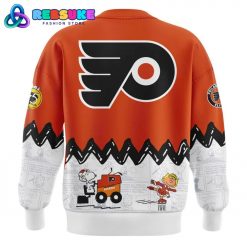 The overall aesthetic of the Philadelphia Flyers x Peanuts Night Special Sweatshirt 2025 successfully integrates two distinct worlds with vibrant color and detailed graphics. The sleeves feature white cuffs and the zigzag pattern, maintaining a sporty and festive look. The back design centers the large Philadelphia Flyers logo, ensuring team pride remains the central focus. The front also includes the subtle presence of Peanuts characters, further cementing the collaborative theme for the December 22 event. This visually engaging design ensures that the Special Sweatshirt is a distinctive and memorable piece of Philadelphia Flyers merchandise for the 2025 Holiday Spectacular.
