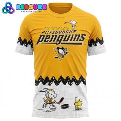 The design of the Pittsburgh Penguins x Peanuts Night Special Shirt is a bright, energetic, and detailed collaboration, centered around the team’s dominant yellow/gold primary color. This vibrant hue covers the majority of the shirt body, providing a sunny backdrop for the team’s official branding. The chest prominently features the “PITTSBURGH PENGUINS” wordmark, along with the team’s iconic penguin logo, which is integrated with subtle illustrations of the Peanuts characters. A key visual element on the front is a graphic of Snoopy, dressed in hockey gear, stick in hand, emphasizing the Penguins Night theme and creating a playful interaction between the hockey motif and the Peanuts crew.