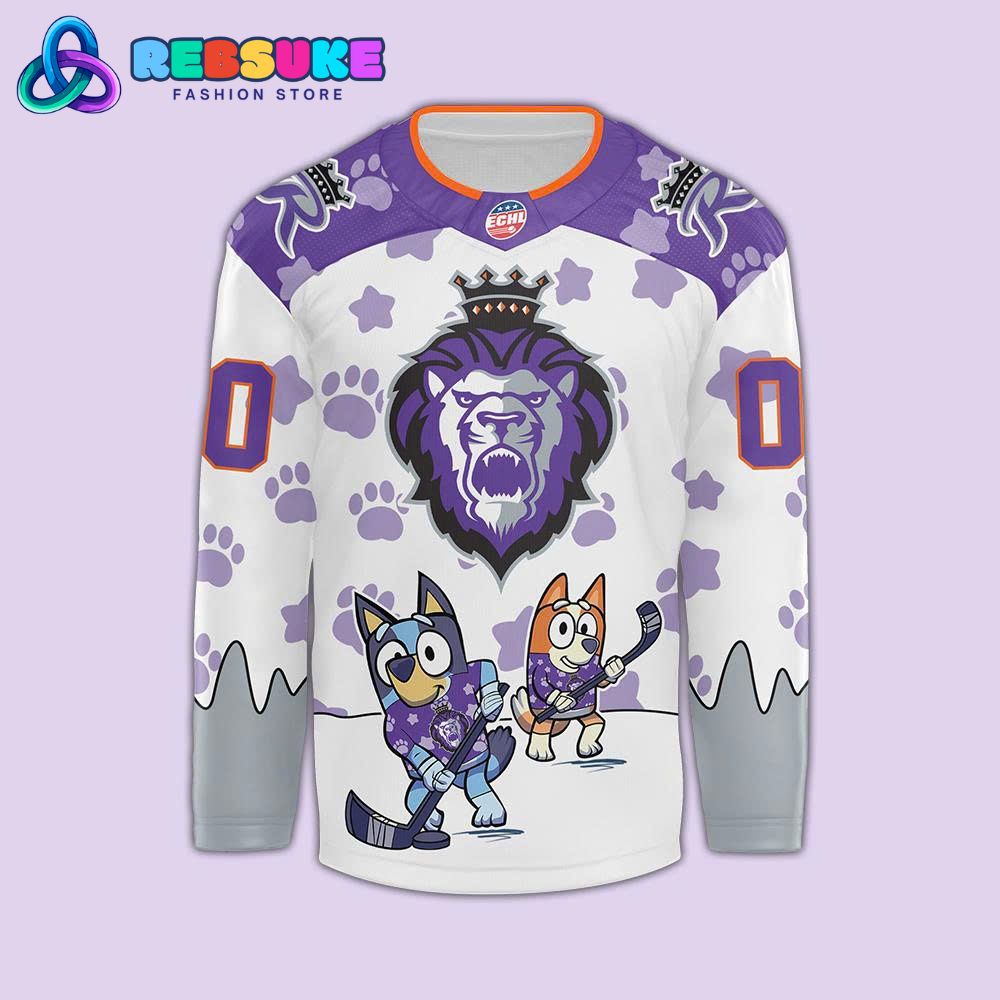 The front of the jersey is anchored by the fierce and regal Reading Royals logo, a purple lion with a crown, positioned prominently in the center. Below this, the playful side of the jersey comes to life with a full-color graphic of Bluey and Bingo, each holding a hockey stick and wearing miniature Reading Royals jerseys. This delightful image captures the spirit of Bluey Day 2025, showing the characters engaging with the team’s sport in a fun and exciting way. The back of the jersey continues this creative theme, with another illustration of Bluey and Bingo, this time positioned at the bottom, underneath the customizable name and number, reinforcing the collaborative nature of the design.