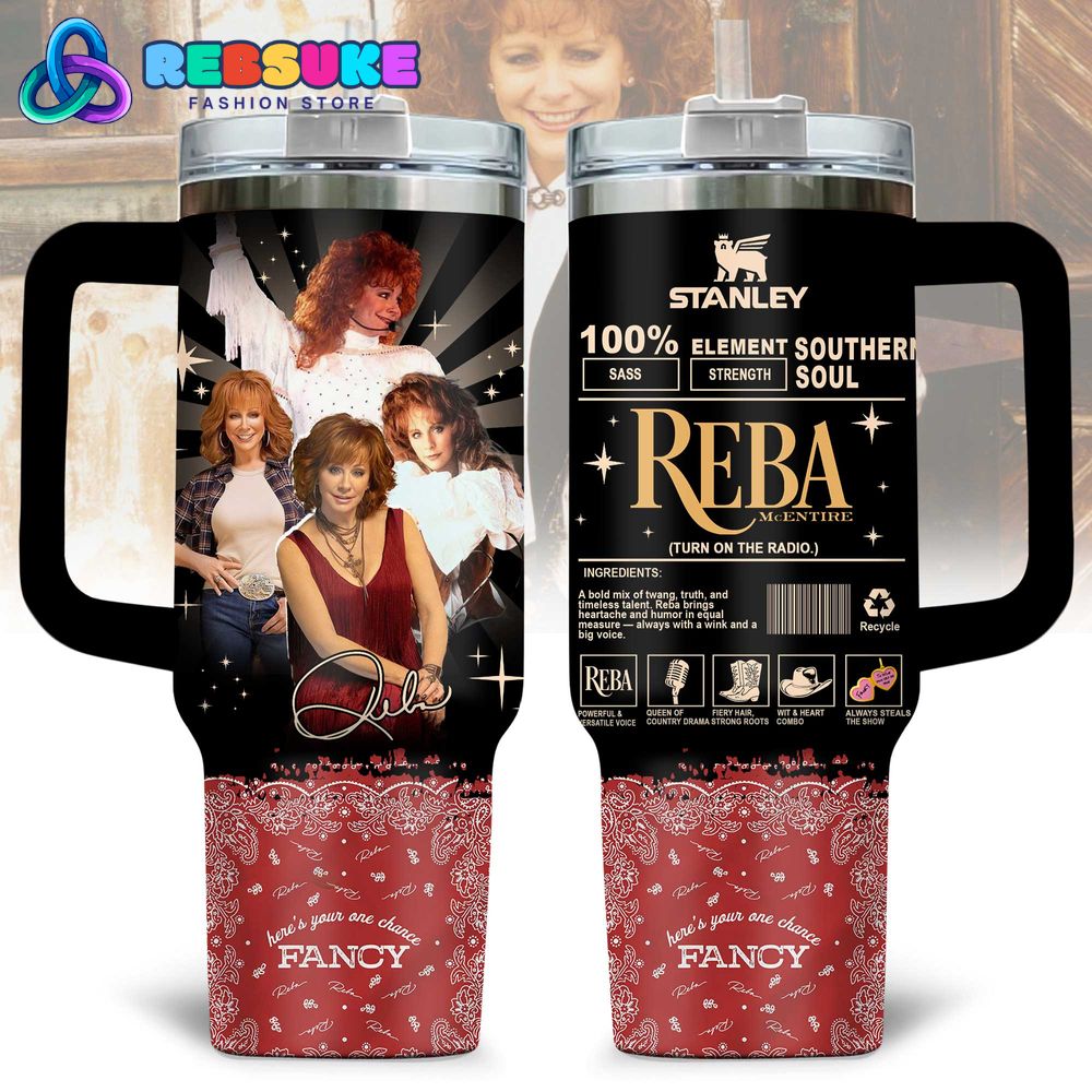 On the reverse, the Reba McEntire Turn On The Radio Stanley Tumbler displays a bold red bandana pattern with “Fancy” and “Reba” text, tying into her hit song and Southern roots. A faux label lists traits like “Sass,” “Element Strength,” and “Southern Soul,” capturing Reba McEntire’s personality. The tagline “Turn On The Radio” adds a nostalgic nod to her music, while icons of her achievements enhance the design, making this Stanley Tumbler a celebration of Reba’s country journey.