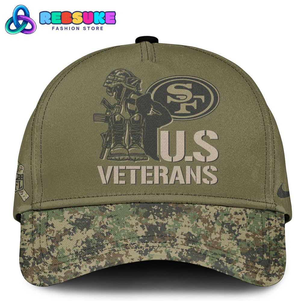 The entire San Francisco 49ers x U.S. Veteran Day Night Game 2025 Hoodie Set is a testament to its cohesive and thoughtful design. The pants maintain the military camo theme, with the 49ers logo and the NFL shield subtly placed near the waistband. The accompanying baseball cap is the perfect finishing piece, with a solid olive green front panel showcasing the saluting soldier and “U.S VETERANS” text. Its brim continues the camouflage pattern, seamlessly tying the entire set together. Every detail of this 49ers apparel, from the color scheme to the placement of each graphic, has been carefully selected to create a piece that is not only a fantastic addition to any fan’s wardrobe but also a meaningful tribute to those who have served our nation.