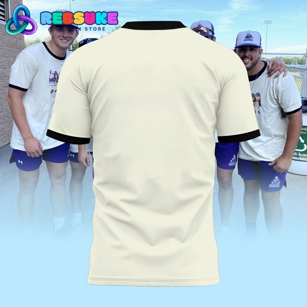 The design of the Saskatoon Berries Friends-themed Berries Limited Edition Shirt is ingeniously created, featuring a classic cream-colored base with contrasting black trim on the collar and sleeves, giving it a timeless and versatile appeal. On the front of the shirt, the centerpiece is a graphic reminiscent of the iconic “Friends” TV show opening credits. It features six caricatures of what appear to be Saskatoon Berries players, styled in a similar fashion to the “Friends” cast, sitting on a couch. This playful and recognizable imagery instantly connects with fans of both the show and the team, creating a strong visual appeal for the limited edition Saskatoon Berries shirt.