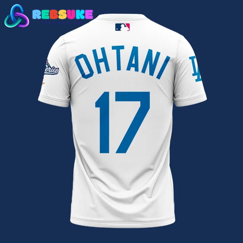 The reverse side of the shirt is a classic player tribute, mirroring a conventional jersey design. “OHTANI” is arched above the large number “17”, both rendered in the Dodgers‘ iconic blue font. The presence of the World Series logo near the collar indicates the level of competition this MVP performance achieved. Most significantly, subtle text and images on the back celebrate a signature pitching performance: “6.0 IP 2 H 0 ER 3 BB 10 K.” These statistics—six innings pitched, two hits, zero earned runs, three walks, and ten strikeouts—serve as a permanent reference to a game that defined Shohei Ohtani’s 2025 legacy. The overall design masterfully weaves together his nickname, his number, and his statistical dominance.