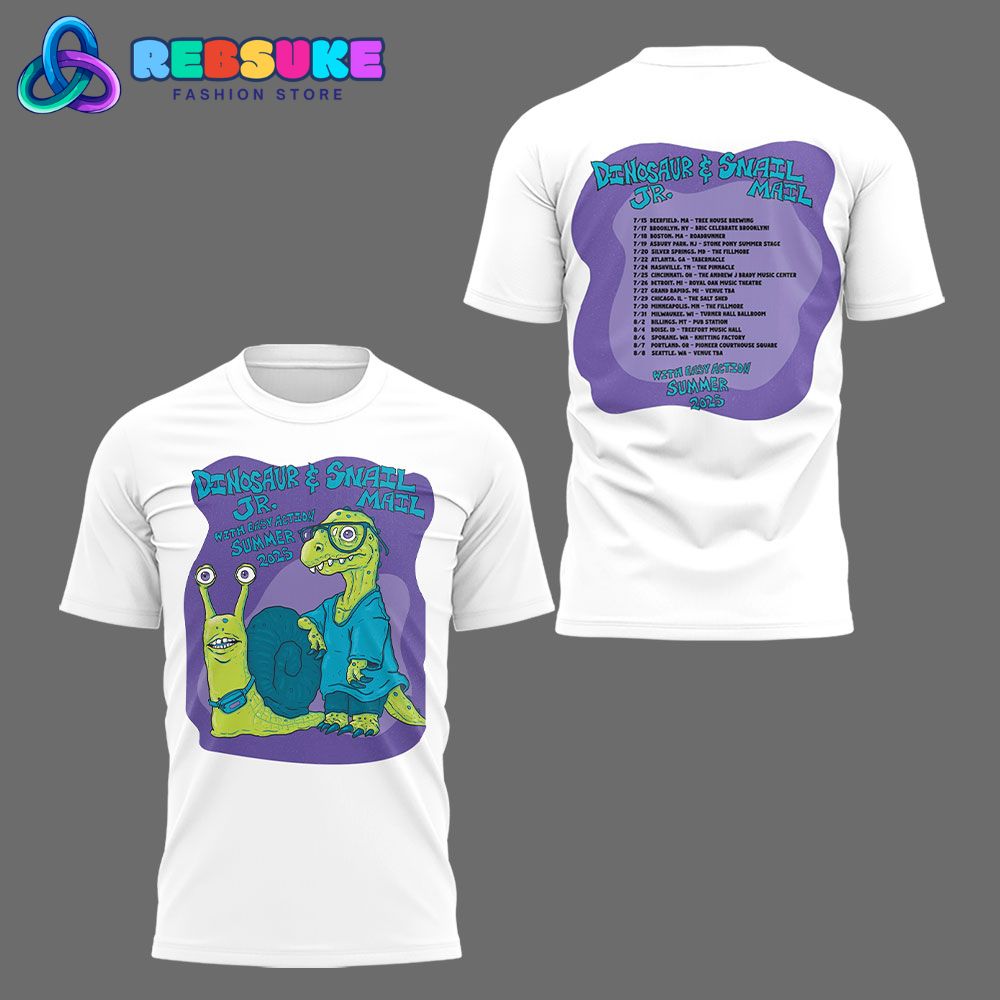 The design of the Snail Mail and Dinosaur Jr. Summer Tour 2025 Special Shirt truly comes to life on its clean white canvas. The whimsical front graphic, featuring the charming snail and dinosaur characters, pops with incredible vibrancy. The crisp background makes every color—from the cool blue of the dinosaur’s cardigan to the bright green of the characters’ skin—appear more vivid and saturated. The playful logos for Snail Mail and Dinosaur Jr. are rendered with exceptional sharpness, creating a visually stunning contrast that makes this special tour shirt an immediate attention-grabber and a beautiful piece of wearable art.