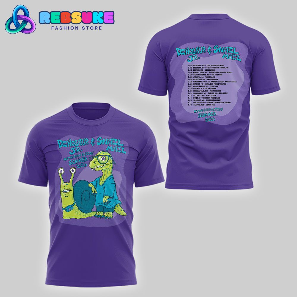 This Snail Mail and Dinosaur Jr. shirt immediately captures the eye with its vibrant purple hue and a charming, one-of-a-kind cartoon graphic on the front. The whimsical design features a clever personification of the bands: a cheerful snail representing Snail Mail alongside a cool, bespectacled dinosaur in a cardigan for Dinosaur Jr. This playful illustration perfectly encapsulates the creative and often quirky spirit of both artists. Above the characters, the tour title, “Dinosaur & Snail Mail With Easy Action Summer 2025,” is printed in a fun, retro-inspired font, completing a look that is both fun and artistically unique for this special tour.