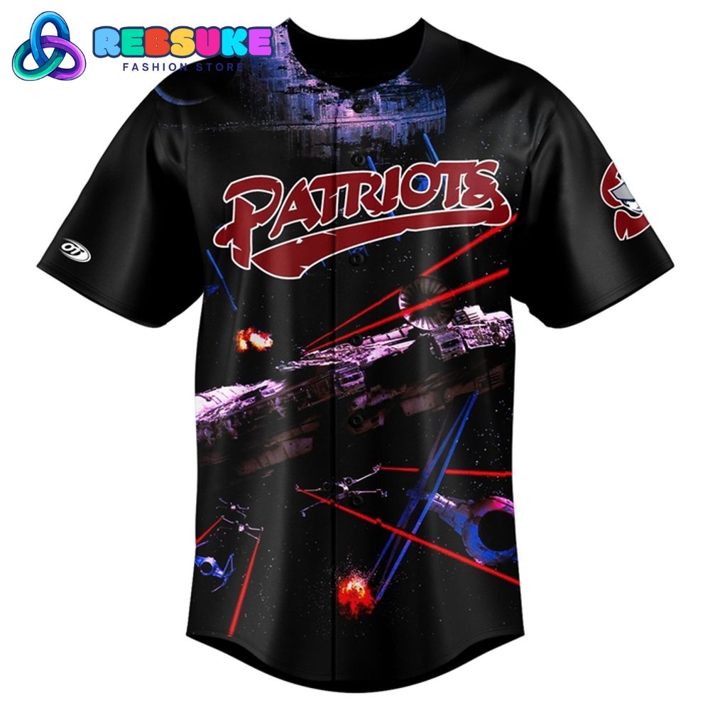 The design of the Somerset Patriots x 2025 Star Wars Night Baseball Jersey is a perfect fusion of team pride and iconic sci-fi imagery. The jersey’s base is a dramatic black, providing a deep, cosmic backdrop for the action-packed graphics. Across the chest, the team name “PATRIOTS” is prominently displayed in a bold, stylized red font with a white outline. This classic team logo is overlaid on a stunning graphic of a galactic battle, with Imperial Star Destroyers and TIE Fighters engaged in combat against the Rebellion’s X-Wings, complete with laser blasts and explosions.