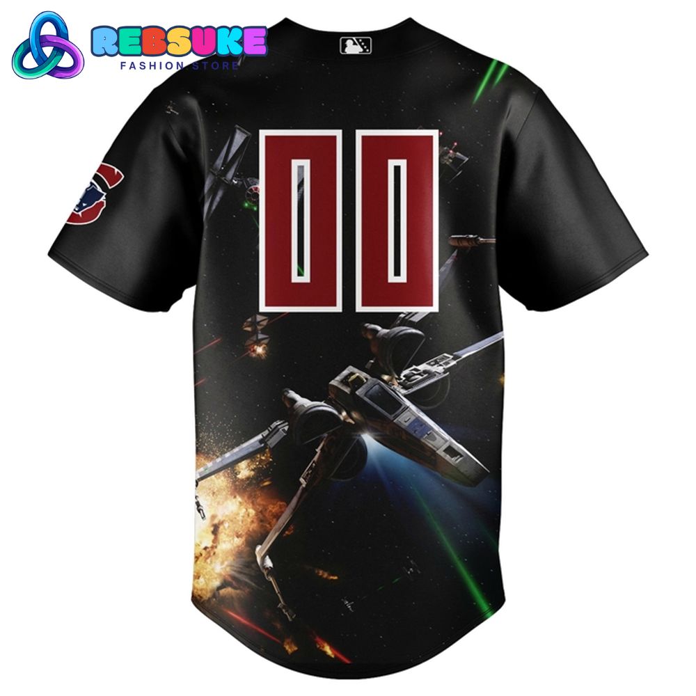 The back of this 2025 jersey continues the epic space battle with a dynamic graphic that covers the entire lower half. An X-Wing fighter soars through the cosmos, firing its lasers and leaving a trail of light. The star-filled background and subtle nebulae add to the immersive feel of the design. Above this detailed scene, a large, bold number, such as “00,” is printed in white with a red outline, a classic look for a baseball jersey. The top of the jersey’s back features the official MLB logo, confirming the authenticity of this collaboration.