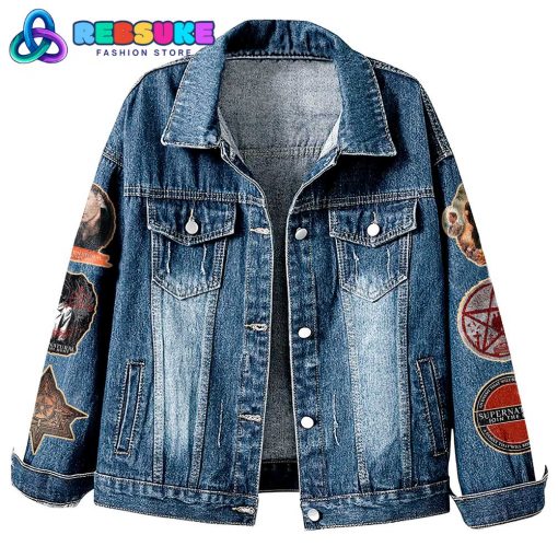 This jacket is adorned with intricate patches that enhance its edgy aesthetic, perfectly reflecting Supernatural’s supernatural themes. The sleeves and sides feature designs like the Impala, the anti-possession symbol, and character portraits in rich colors, adding a nostalgic and thematic flair to the jacket. The front maintains a classic denim look with two chest pockets and button closures, making it a versatile piece that pairs effortlessly with any outfit, from jeans to boots.