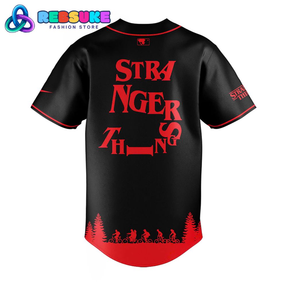 Turning the jersey over reveals a descent into cryptic chaos. The words “STRANGER THINGS” are deconstructed on the back, scattered and distorted in a chilling message that seems to be pulled apart by an unseen force. The letters drip and warp, as if being corrupted by the influence of the Upside Down itself. This eerie and brilliant typographic design makes this special baseball jersey feel thrillingly alive and dangerous. The silhouette of the bike-riding friends continues along the bottom, a constant reminder of the human story at the heart of this interdimensional conflict.