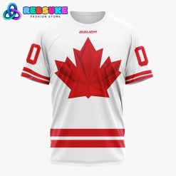 The design of the Team Canada Personalized White 2026 Olympic Hoodie is characterized by a clean, crisp aesthetic, utilizing a brilliant white base that powerfully contrasts with bold red and black elements. The front of the hoodie features a massive, stylized maple leaf—the unambiguous symbol of Canada—rendered in a rich red color, outlined sharply in black, and prominently positioned beneath the “Bauer” branding. This striking focal point immediately identifies the garment as Team Canada apparel and captures the spirit of the 2026 Olympic competition with its powerful visual impact. The simplicity of the white background makes the iconic red maple leaf truly pop, ensuring maximum visibility and national pride.