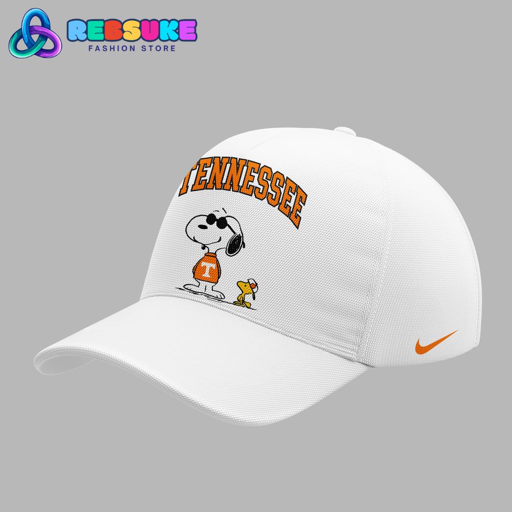 The Tennessee Volunteers baseball cap completes this special edition collection, featuring a clean white design with carefully placed graphics. On the front of the Tennessee Volunteers cap, the word “TENNESSEE” is prominently embroidered in the same distinctive orange collegiate font as seen on the hoodie and sweatpants. Below this, the familiar duo of Snoopy, wearing his Tennessee Volunteers jersey, and Woodstock, sporting his team cap, adds a touch of playful charm. The side of the Tennessee Volunteers cap features the iconic ‘T’ logo in bold orange, further solidifying the team allegiance. This Tennessee Volunteers cap is the perfect finishing touch to the Tennessee Volunteers x Peanuts ensemble.