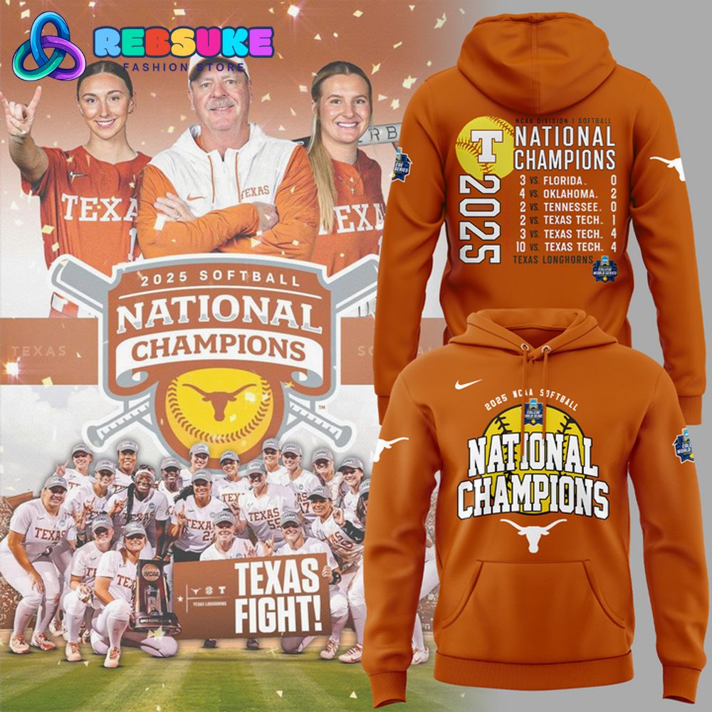 Turning to the back of the hoodie within the Texas Longhorns Softball 2025 National Champions Special Hoodie Set, the celebration continues with a detailed list of the team’s dominant performance. It highlights key victories leading up to the championship, showcasing the scores against formidable opponents like Florida, Oklahoma, Tennessee, and Texas Tech, ultimately culminating in the Texas Longhorns’ National Championship. This detailed record not only commemorates the victory but also emphasizes the team’s journey and unwavering strength throughout the 2025 season. The bold “NATIONAL CHAMPIONS” text is repeated, ensuring the message of victory is paramount, while the visual includes a large softball graphic, reinforcing the sport.