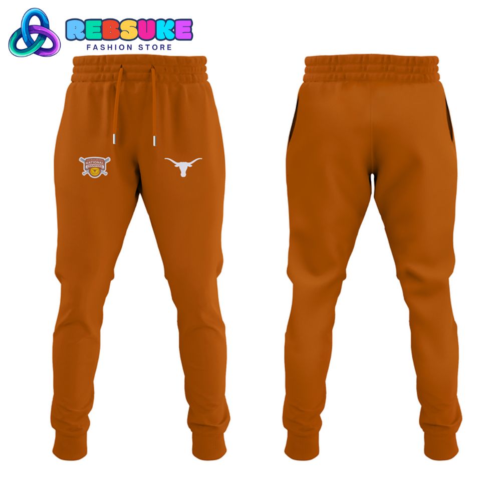 The Texas Longhorns Softball 2025 National Champions Special Hoodie Set features a powerful and celebratory design across its components. The hoodie proudly displays “2025 Softball NATIONAL CHAMPIONS” prominently on the chest, often accompanied by the iconic Texas Longhorns “Longhorn” logo and a softball graphic, symbolizing the team’s victory. The vibrant burnt orange color of the hoodie immediately connects it to the Texas Longhorns identity, ensuring instant recognition. The design is bold and clear, celebrating the pinnacle of collegiate softball achievement. The front also features the official NCAA Softball logo and a Nike swoosh, signifying quality and official recognition, making it a legitimate piece of championship apparel that fans will be proud to wear.