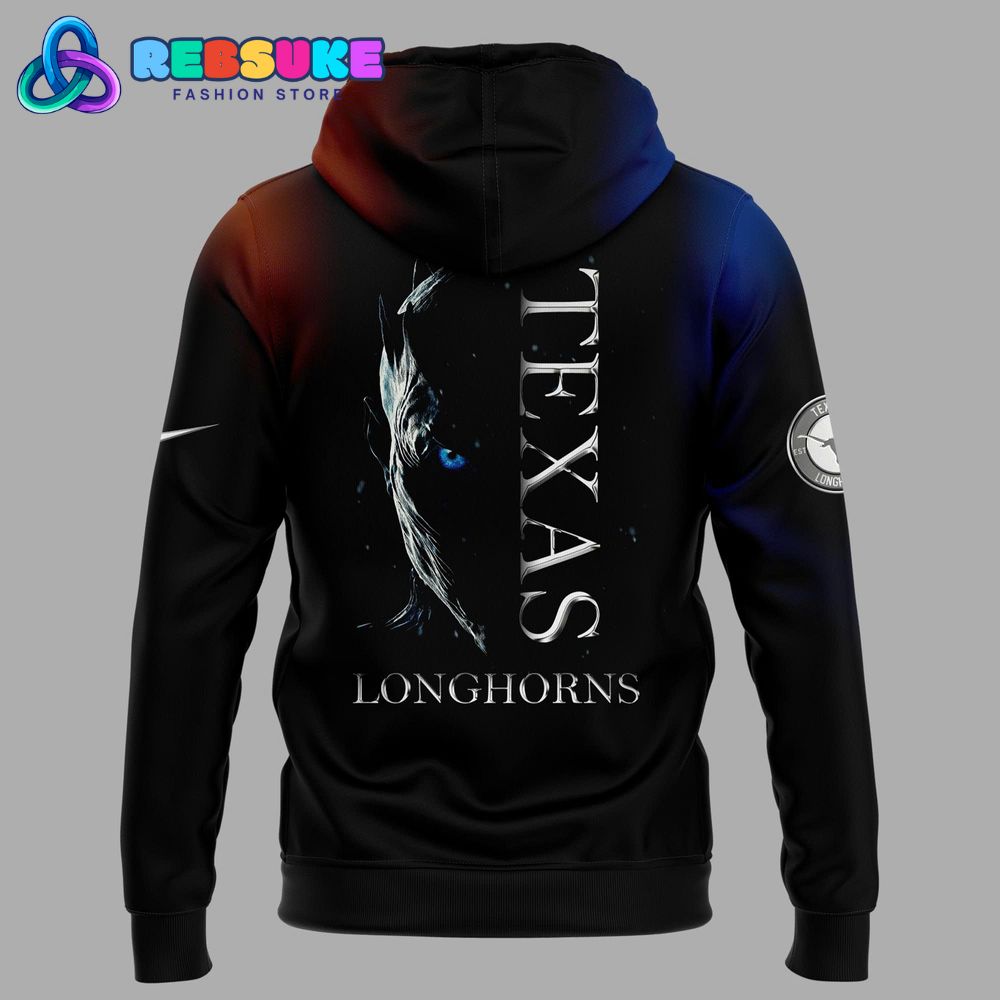 The reverse of the Texas Longhorns x Game of Thrones Limited 2025 Hoodie is equally impressive, featuring a large, ghostly graphic of a wight or a White Walker, with glowing blue eyes, emerging from the shadows. The words “TEXAS” and “LONGHORNS” are written vertically and horizontally, respectively, in a bold, stylized font that is reminiscent of the show’s logo. The design on the back transforms the hoodie from a simple garment into a powerful statement of fantasy and athletic pride. This striking back graphic is sure to turn heads and spark conversations among fellow fans and fantasy enthusiasts alike, making it a truly unique piece for the 2025 season.