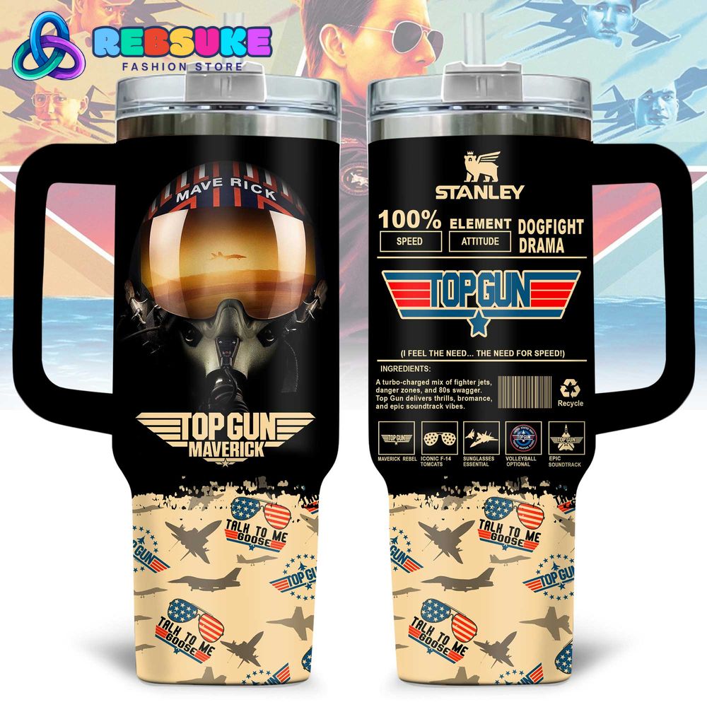 On the reverse, the Top Gun Maverick Dogfight Drama Special Stanley Tumbler showcases a beige pattern with “Talk to Me Goose” and jet silhouettes, evoking nostalgia from the original. A faux label lists traits like “Speed,” “Element Attitude,” and “Dogfight Drama,” with the tagline “I Feel the Need… The Need for Speed!” adding a classic touch. Icons of jets and sunglasses enhance the design, making this Stanley Tumbler a tribute to Top Gun Maverick’s iconic moments.