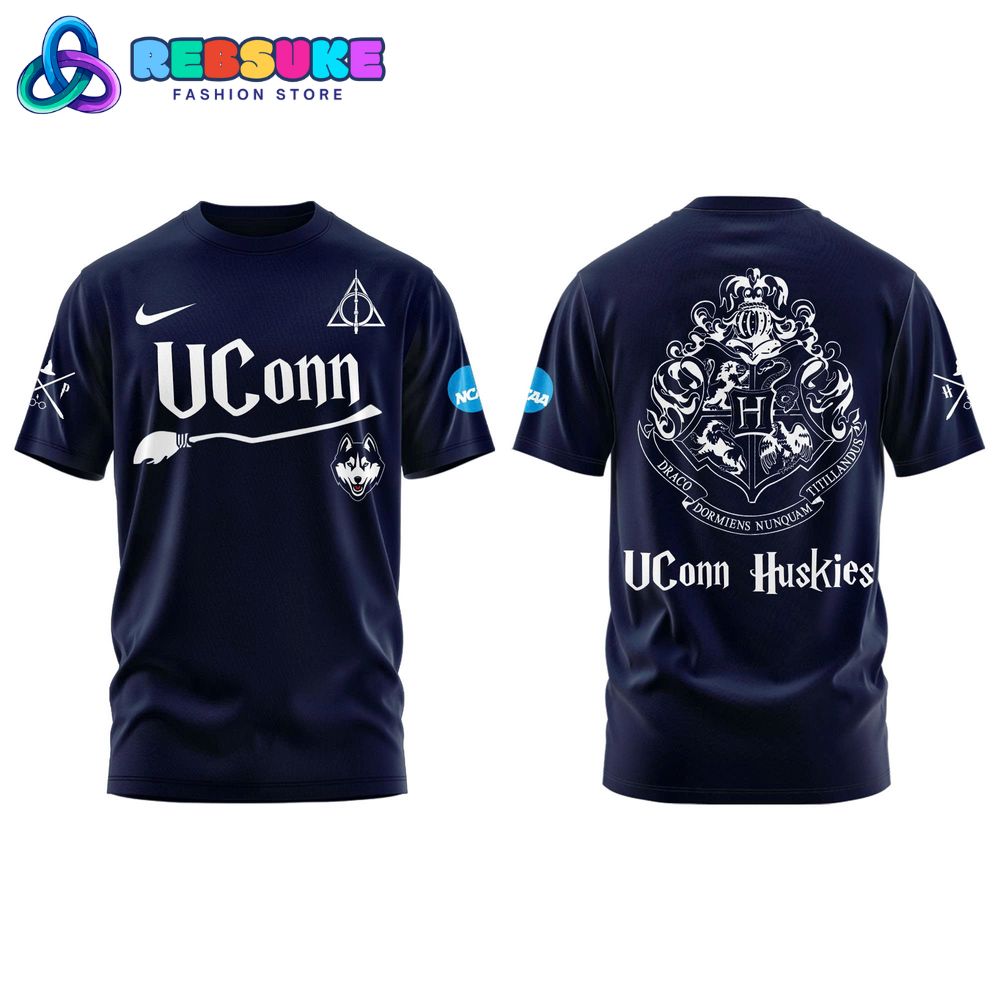 The design of the UConn Huskies x Harry Potter Night 2025 Shirt is a creative and intricate blend of team spirit and wizarding lore. The shirt’s primary color is a rich navy blue, a perfect representation of the UConn Huskies’ official colors. The front of the shirt features a unique logo that creatively merges both themes: the text “UConn” is stylized to resemble a broomstick, while the classic Huskies logo is displayed prominently. The design is subtly accented with the triangular Deathly Hallows symbol, providing a clever reference to the Harry Potter universe for those in the know. The official Nike swoosh and NCAA logo on the sleeves add an extra layer of authenticity to this collegiate-themed apparel.