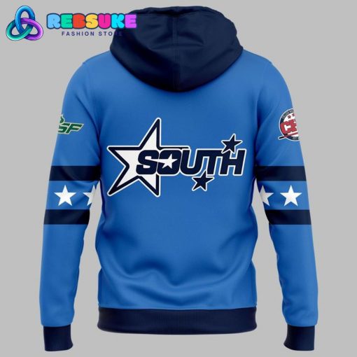 The USF Women’s 2025 College Hockey South All-Star Challenge Hoodie Set features a dynamic design that showcases the Bulls’ team pride in vibrant detail. The hoodie is predominantly light blue with dark blue accents, prominently displaying the word “South” across the chest in bold white lettering, accompanied by a large star that symbolizes the South All-Star Challenge. The USF logo is subtly incorporated, ensuring this Hoodie Set reflects the team’s identity while celebrating the 2025 college hockey event with a unified and spirited look.