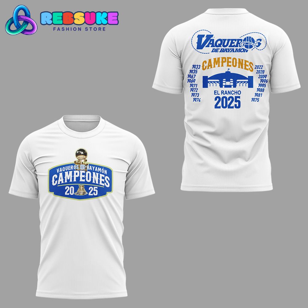 The reverse side of the Vaqueros de Bayamón Champions Baloncesto Superior Nacional 2025 Shirt is an even more detailed tribute to the team’s history. The top of the shirt features the team’s logo, with the name “VAQUEROS DE BAYAMÓN” and a basketball graphic, reinforcing the shirt’s theme. The words “CAMPEONES” are also proudly displayed on the back, but the most significant detail is the list of championship years below it. The phrase “EL RANCHO” is also featured, celebrating the team’s home arena. This list of years, including the 2025 victory, serves as a testament to the franchise’s rich and successful history, making the shirt a true collector’s item.
