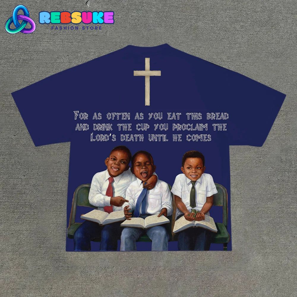 Turning the shirt over reveals a design that deepens the spiritual message with profound symbolism and scripture. At the top, a simple yet powerful cross stands as the central icon of the Christian faith. Beneath it, the scripture “For as often as you eat this bread and drink the cup you proclaim the Lord’s death until He comes” is elegantly written. This verse from 1 Corinthians 11:26 directly references the act of communion, often observed on the First Sunday, adding a layer of theological significance. This thoughtful inclusion transforms the blue graphic shirt into a piece of wearable doctrine, making the Vintage Children First Sunday Print Graphic Shirt a powerful tool for personal testimony and reflection on the core tenets of faith.