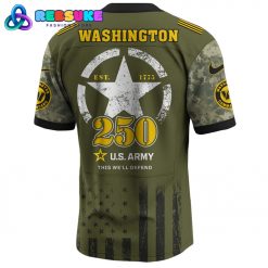 Turning to the back of the Washington Commanders NFL x U.S. Army 250th Birthday Celebration Jersey, the design truly comes alive with its profound celebratory message and historical resonance. The prominent “WASHINGTON” arches across the upper back, immediately identifying your team’s proud city, while the centerpiece is a distressed, large white star with “EST. 1775” boldly displayed within, commemorating the U.S. Army’s founding year. Underneath, a large, weathered “250” in gold signifies the momentous 250th birthday of the U.S. Army, underscored by the “U.S. ARMY” text and the resolute motto “THIS WE’LL DEFEND.” This intricately detailed back design eloquently narrates the story of dedication, strength, and legacy, making this Washington Commanders NFL x U.S. Army 250th Birthday Celebration Jersey a true collector’s item and a compelling conversation starter.